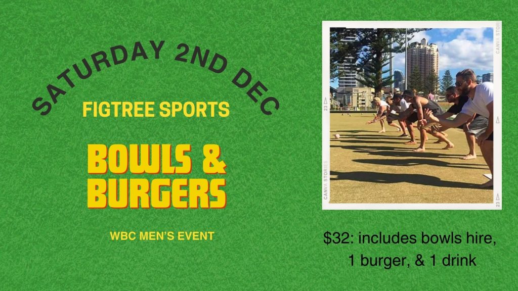 Join the men of WBC at Figtree Sports for an afternoon of bowls, burgers, and beverages. The cost $32 to cover bowls hire, 1 burger, and 1 drink. Guests are free. Bookings close on Sunday 26th November.